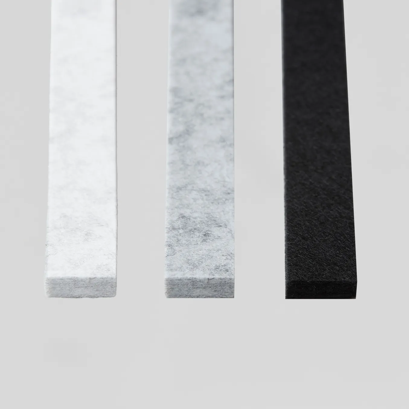 Podczas korzystania z listwy wykończeniowej potrzebna jest listwa łącząca z materiału filcowego RecoSilent. Listwa łącząca pomaga łatwo zamontować listwę wykończeniową na końcowym panelu łupkowym i uzyskać ładne wykończenie na ścianie listwy. Listwa łącząca wypełnia odstępy powstałe podczas korzystania z listwy wykończeniowej wzdłuż boku panelu zakończonego drewnianą listwą.